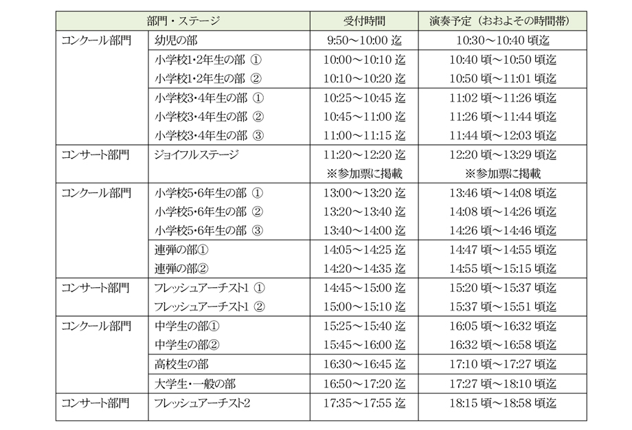 ホームページ上でも確認できるように、同様の内容を掲載致します。尚、今回は参加票(ハガキ)を作成、表面に各自の参加部門・クループ分け、演奏番号、受付時間帯を記載。裏面に練習室の使用時間、おおまかな本番のグループ別演奏時間帯を記載しておりますので、それらに関しては各自の参加票をご確認ください。